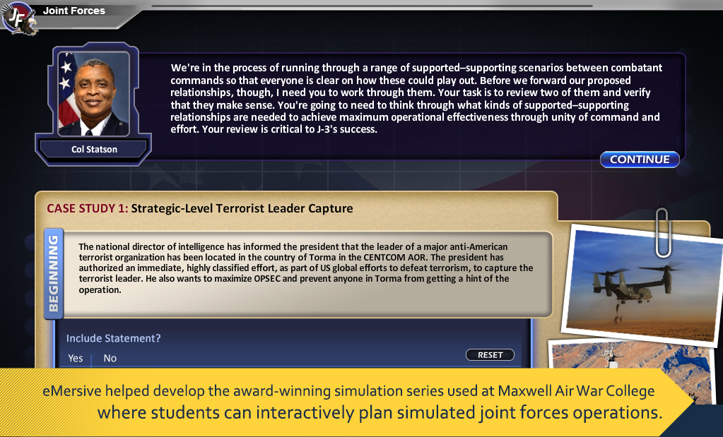 eMersive's platform allows for learners to virtually step onto the battlefield, into the operating room, or into any other dangerous or hazardous environment and learn in an environment freed from real-world consequences where learning can be truly enhanced.